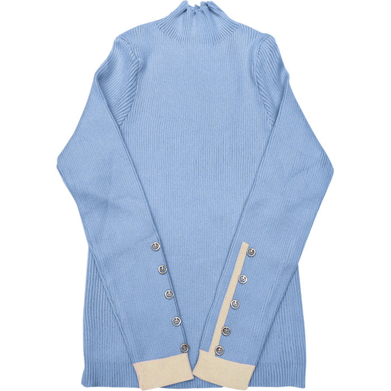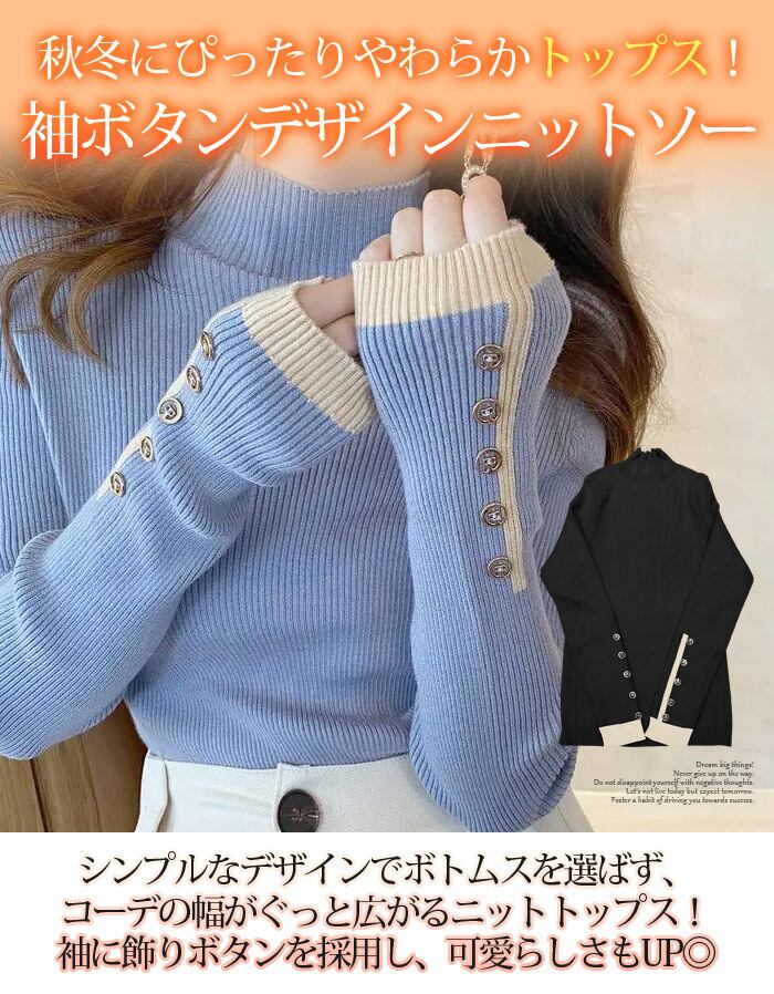 袖ボタンデザインリブニットソー ハイネック ニット レディース ニット生地 ニットソー 秋服 春服 トップス 長袖 無地 レディース秋 リブ ストレッチ フェイクボタン かわいい