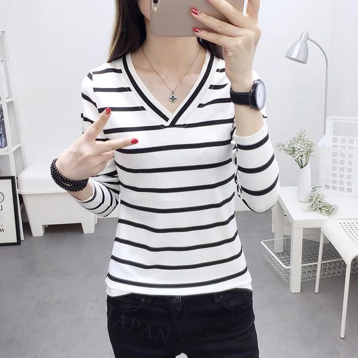 Tシャツ カットソー 長袖Tシャツ ロンT Vネック ボーダー インナー 長袖 ストレッチ 伸縮性 白 黒 なめらか とろみ レディース