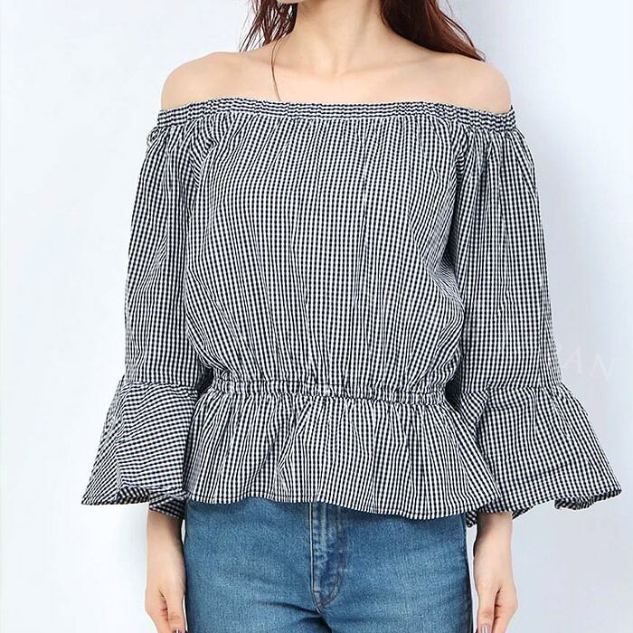 ブラウス レディース 長袖 七分袖 おしゃれ 夏 春 春夏 tシャツ オフショルダー 肩出し カットソー フリル袖 フリル チェック 綿 綿ブラウス 上品 コーデ 送料無料 トレンド 人気 ランキング レディースファッション 韓国ファッション シャツランキング ブラウスランキング セドールジャパン セドールJAPAN セドールjapan